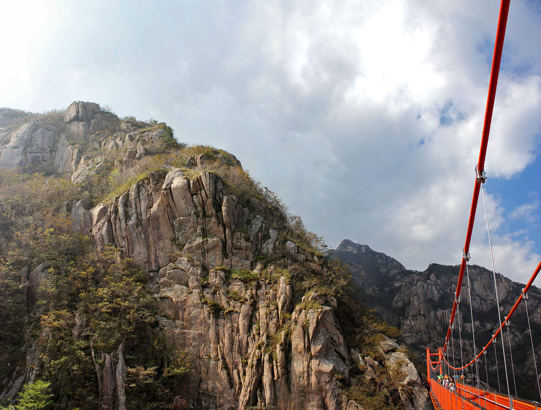 Search for Wolchulsan on any english language Korean tourist websites and you will immediately find references to the ‘cloud bridge,’ a suspension bridge between two peaks about 700 metres high. Once you have experienced the severity of the slopes at this end of Wolchulsan, it is easy to understand why such an ambitious construction project was necessary. The cloud bridge is an incongruous bright orange colour, but the views it offers and the novelty it presents are certainly an interesting experience. Expect large numbers of people posing for photos, and young children whooping and hollering into the valley as they bounce across the bridge. (Yes, the bridge does shake a little, especially if you jump up and down.)
