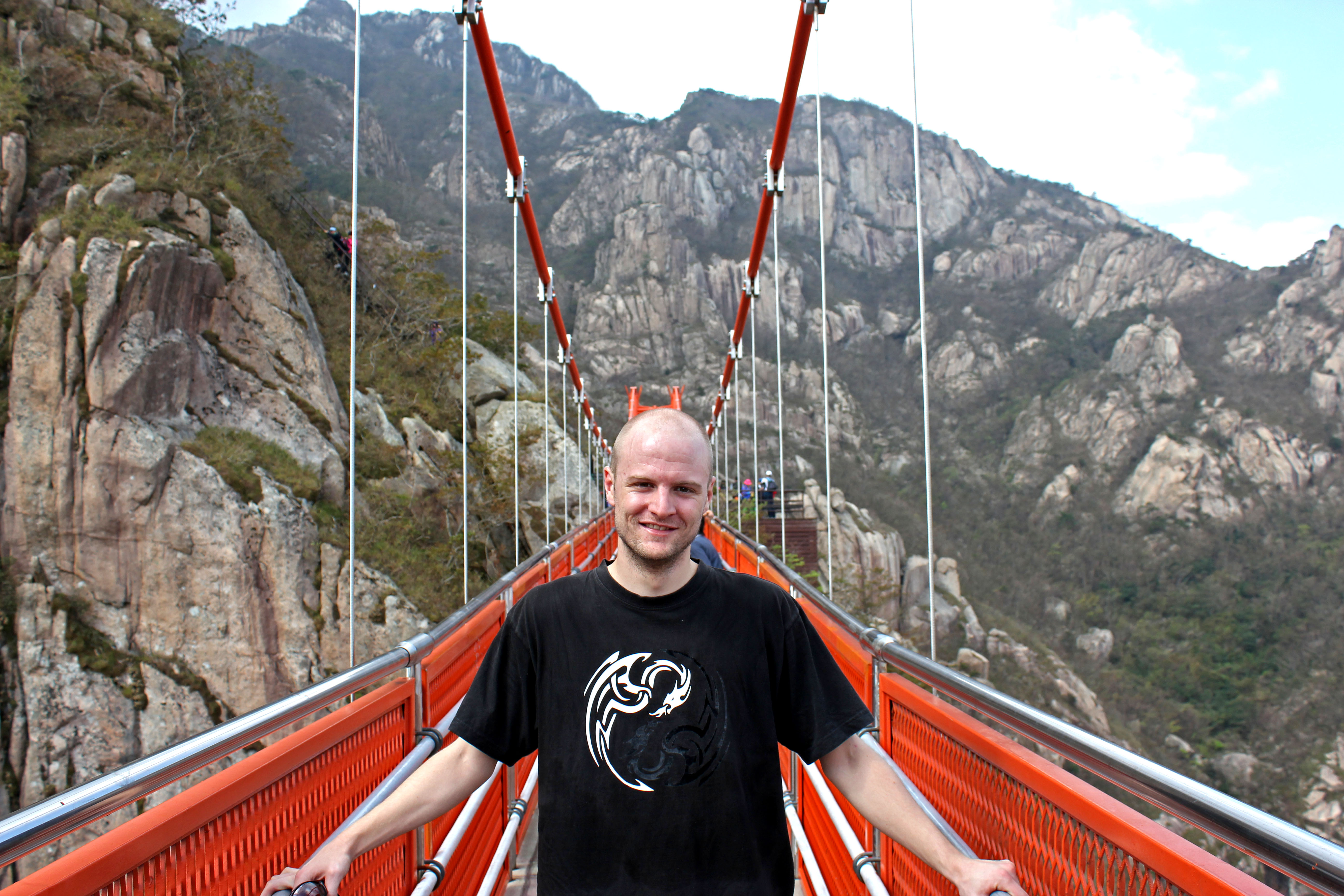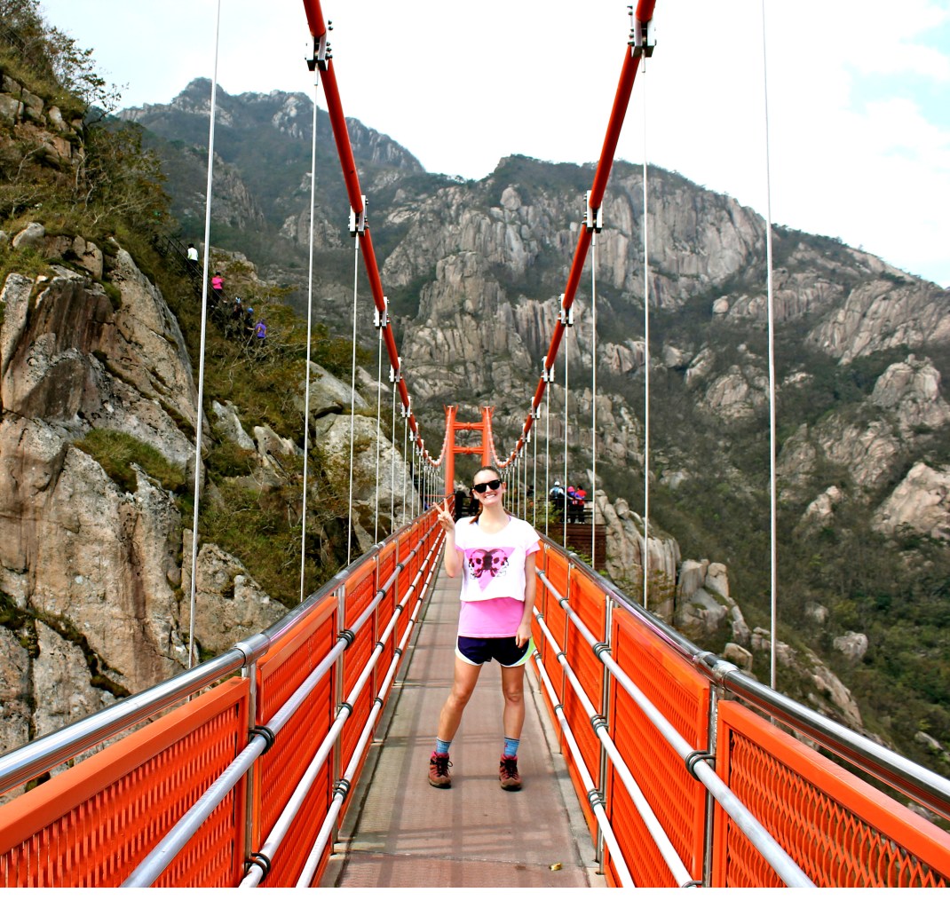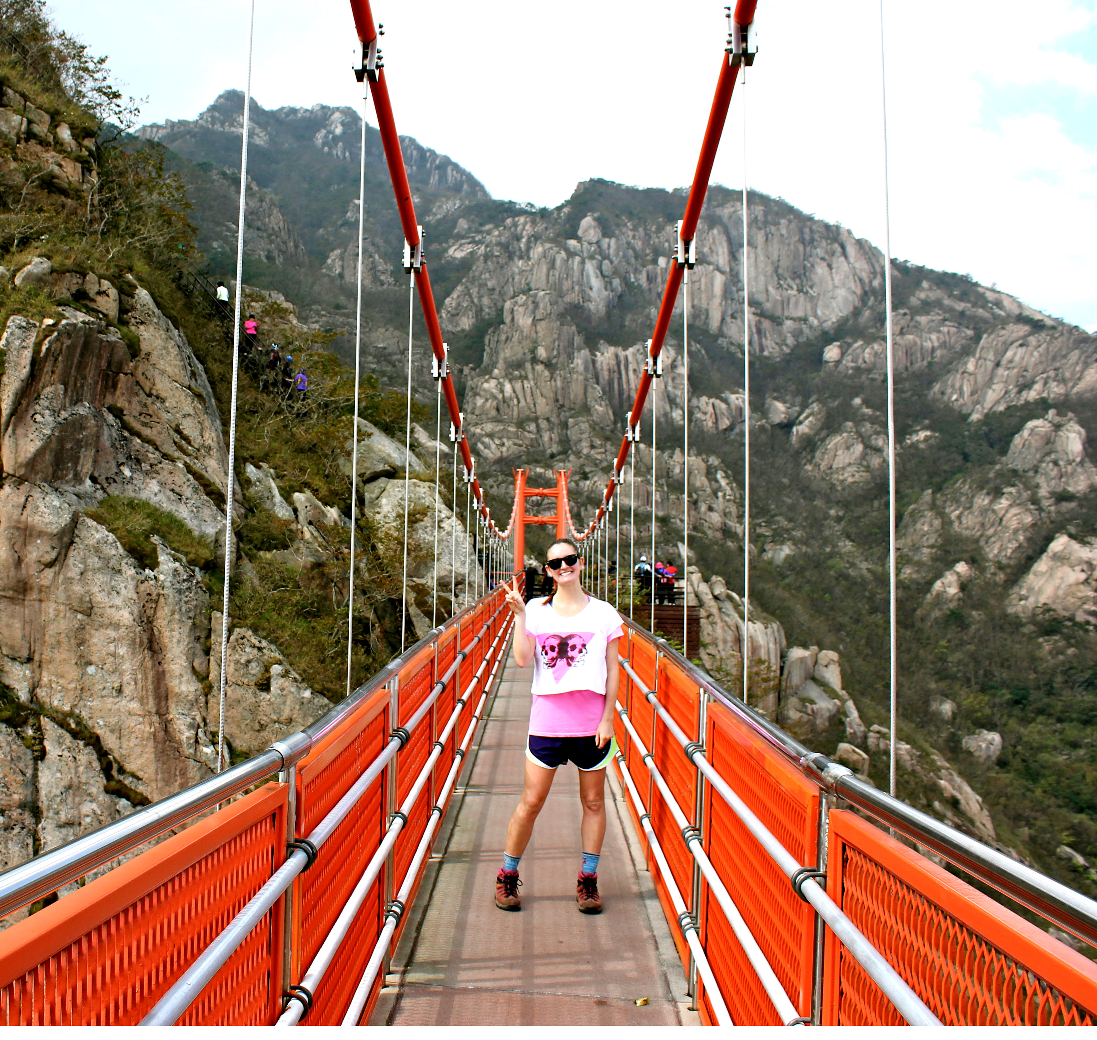 From the trail head, you will pass a campsite with platforms rented for tents, and a shelter. Here is the last place to get water. (Please note: like Seoraksan, there is NO fresh water available on Wolchulsan. The hike from Cheonghwangsa to Dogapsa is about 6 or 7 hours (if you spend an hour or so in total at the various peaks) so pack accordingly.) After the shelter is a short walk through some bamboo thickets. After about 10 minutes you will arrive at a fork. To the left, 50 metres up the trail, is a temple that was undergoing a large amount of construction and seemed to be deserted. To the right is the main trail. From here the trail is steep, and involves a large number of ropes and railings, climbing over large boulders, all the while the sheer face of the mountain towers above. About 20 minutes later there will be another fork, with signs for the waterfall to the right and the cloud bridge to the left. From this fork the cloud bridge is clearly visible almost directly above you, and the sign states 0.5 kilometres, and a ten minute hike. We looked up and thought ‘How?!’ I remembering saying that there must be ladders, or an elevator. There was no elevator, but in many places the stairs were so steep that they surely straddled the line between stair and ladder, and in some places there simply were ladders. Needless to say, it was hard going, but the pain is very short and sharp, and you will quickly find yourself at the cloud bridge. The cloud bridge is painted an incongruent bright orange. If you visit during a peak time, expect to find yourself surrounding by people posing for photos on the bridge, next to the bridge, behind the bridge, everywhere. To be sure, it’s a great photo spot. As you cross, be sure to jump up and down a little to feel the bridge bounce. Action shots of people running across the bridge are also fun.
