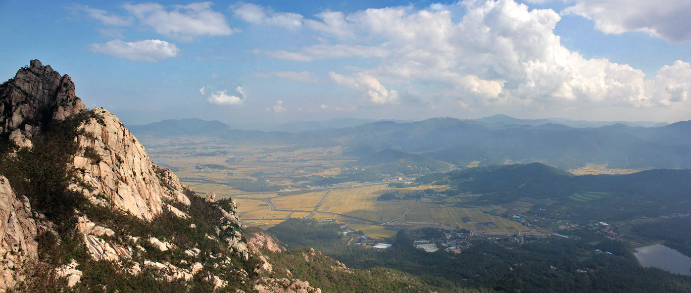Long ago in feudal Japan, groups of aristocrats would have ‘moon-viewing parties’. They would climb towers specifically built for the purpose and gaze at the autumn moon over bowls of saké and the gentle trembling of a zither. The name ‘Wolchulsan’ means ‘moon-rise mountain’, and one can easily understand why this experience of the mountain would take precedence: Wolchulsan bursts from the flatlands like a fortress. There are two main entrances, at Cheonghwangsa and at Dogapsa. The trail between these two is the main route across the park, taking in the main peaks and the cloud bridge. Near Dogapsa, the slopes are gentle and heavily forested, reminiscent of the oceanic undulations of Jirisan. At the Cheonghwangsa entrance, where we began our hike, the slopes are jagged and almost sheer; they are not as massive or impenetrable as Seoraksan, but as I will note many times, it is the juxtaposition between the flat farmland and the sudden, skeletal mountain that is the most striking characteristic of Wolchulsan.