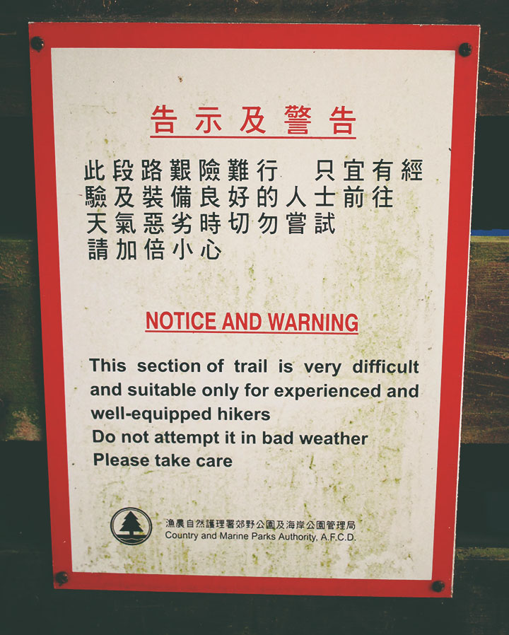 There are a few more things to clear up about this so-called Dragon’s Back walk. Blogs, online guides and even the tourist pamphlets  picked up at the airport list the Dragon’s Back as a “moderately difficult 6-hour hike.” Whooee! I don’t even know where to begin critiquing this assessment. At the trailhead, there is an ominous sign warning you of the challenges ahead, recommending that only experienced hikers proceed. This warming is false, even by the most conservative of standards. The trail map lists Shek O Peak, at a mere 284 meters, as a 1-2 hour hike from the trailhead. Magalie and I were casually strolling along the path, stopping to take tons of photos. It took us less than 45 minutes. To complete the entire course at a moderately slow pace from Dragon’s Back to Shek O took us about 3 hours.