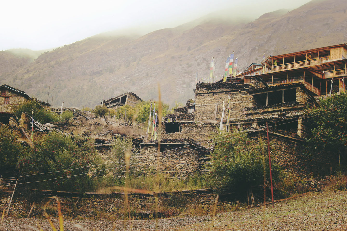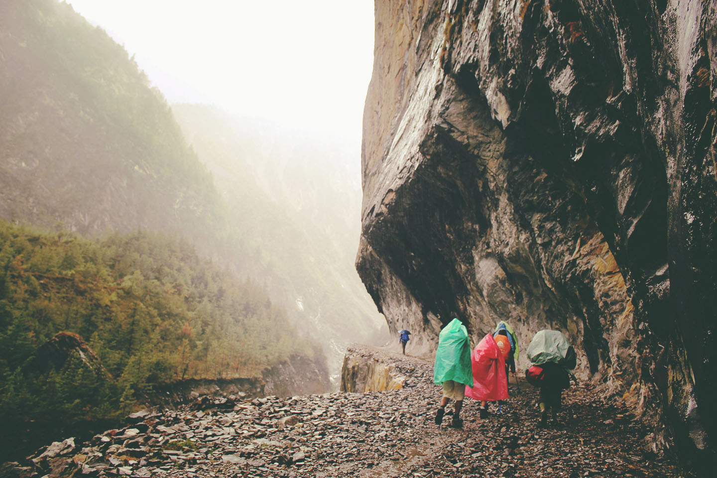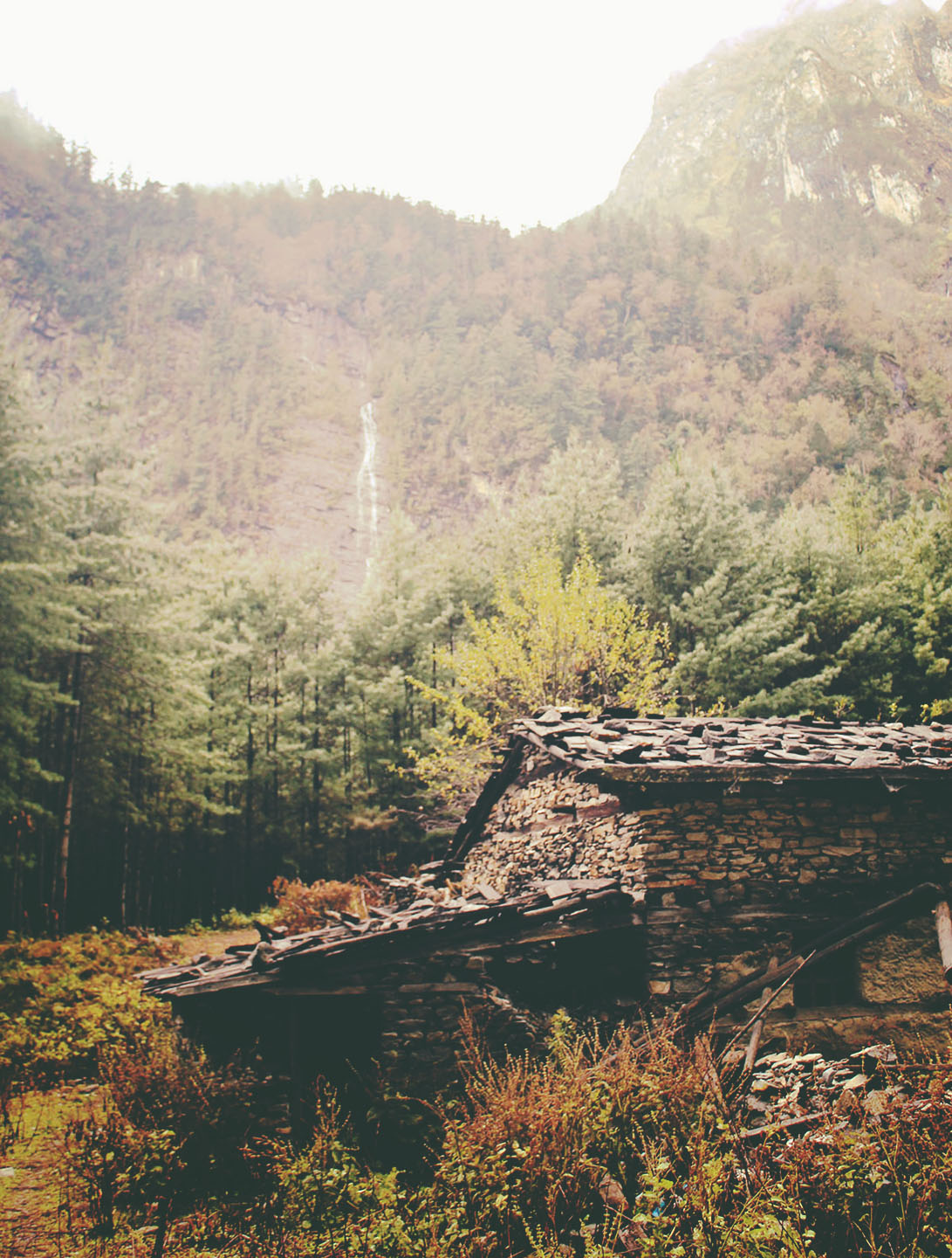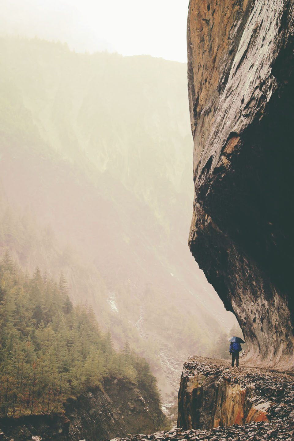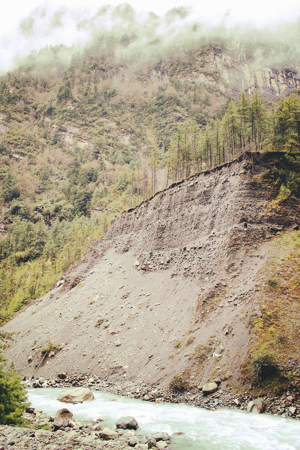 We left Chame early to try and beat the unpleasant crowds we had experienced on the worst day.  Shortly after leaving Chame, we entered a dense pine forest. The wet weather persisted; fog and clouds shrouded the Himalayas in an ethereal blanket. It almost felt like I was back in The Bay Area! On either side of the trail, the mountains rose above, dissected and deeply carved by landslides and weather erosion. At times, we were walking directly in the path of probable disaster: it was unsettling and precarious at best.