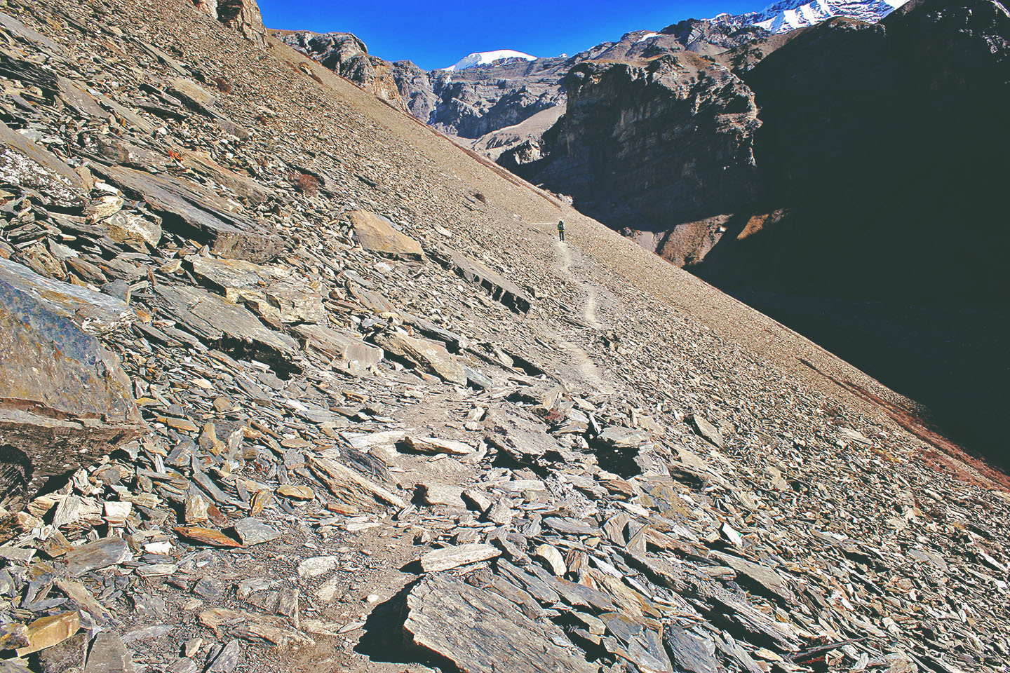 After 1 hour, we descended to cross a bridge. We had entered a serious landslide danger zone. To our left was a vertical wall made of loose rocks threatening to make a run down the valley at any moment. To our right was a steep plummet to certain death into rushing water below. Walking fast was out of the question, breathing was challenging enough as it was. Cassandra and I simply couldn’t keep up with Trevor’s feverish pace; he seemed to be experiencing zero symptoms from the altitude.