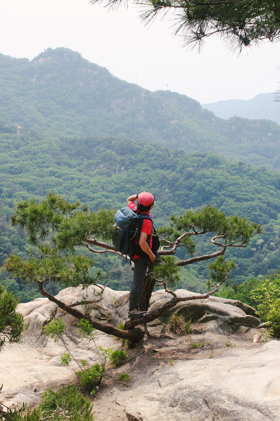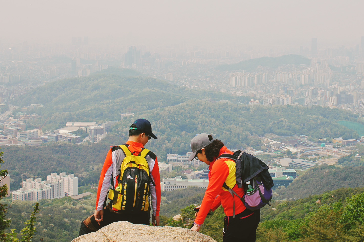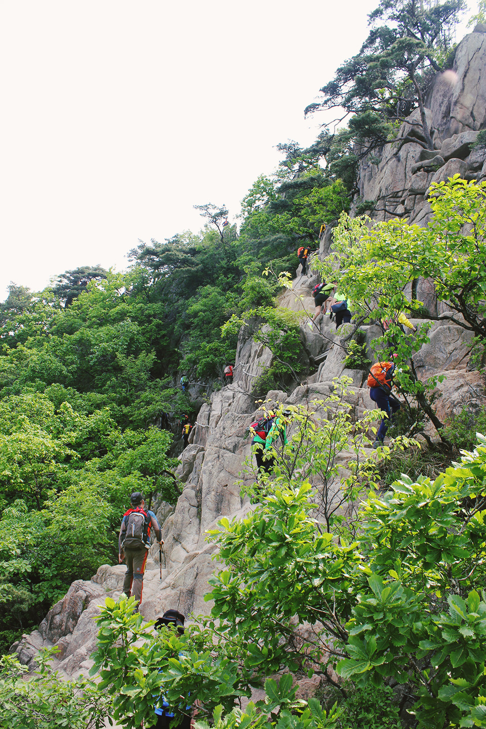 the summit of Gwanakansan, falls a full 200 meters short of Baegundae, the majestic peak of Bukhansan. Despite is relatively miniature height, Gwanaksan offers up an abundance of dramatic climbing and unbeatable views. The mountain is teeming with enough requisite Korean stereotypes to entertain even the most uninterested outdoor un-enthusiast: couples hiking outfits, photos taken in the most absurd of poses and, of course, the groups of older men wilding out on the mountain with half a dozen soju bottles.